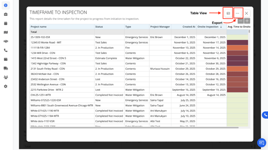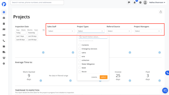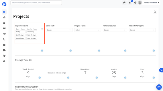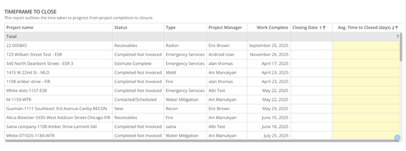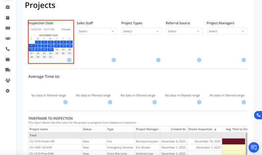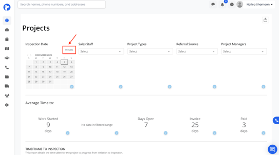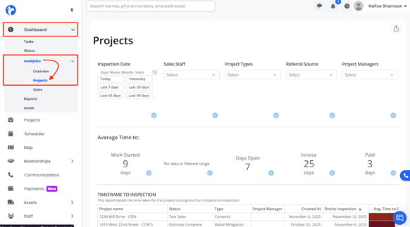 The Analytics → Projects dashboard provides an in-depth view of your company’s project performance, timelines, and operational efficiency. This dashboard helps you understand how long projects take to move through each stage, how quickly work begins, how fast projects close, and how your project managers contribute to revenue. This is especially useful for owners, production managers, and anyone monitoring job performance or workflow.
