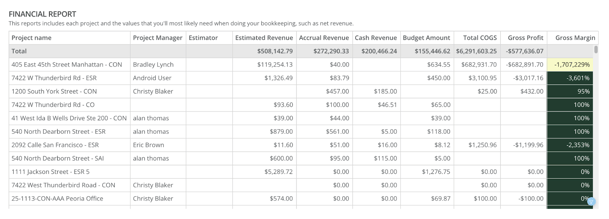 A full financial breakdown of each project, pulled directly from the project's Financial tab.