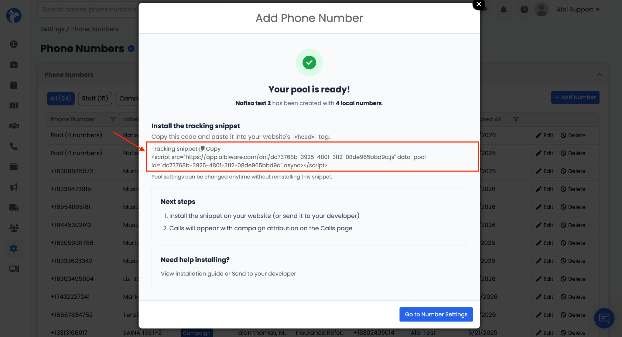 - When a visitor lands on your website, the snippet calls Albi's API and gets a tracking phone number from the pool