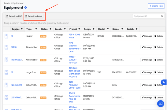 The Export to Excel option allows you to download your Equipment Dashboard data into an Excel (.xlsx) file. This is especially helpful if you want to:
