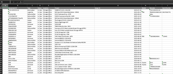 When you click Export to Excel, Albiware will generate an Excel file containing all the equipment currently visible in your dashboard view. If you’ve applied filters (for example, showing only Dehumidifiers or equipment In Use at the Chicago Office), only those filtered results will appear in your export.