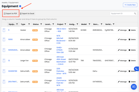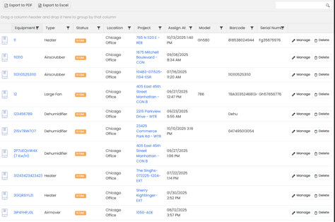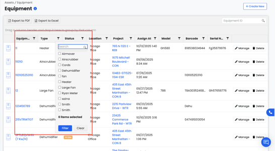 - Filter columns to quickly find what you’re looking for. For instance, you can filter by Type to only view Heaters or Air Scrubbers, or filter by Location to see equipment assigned to a specific office or job site.