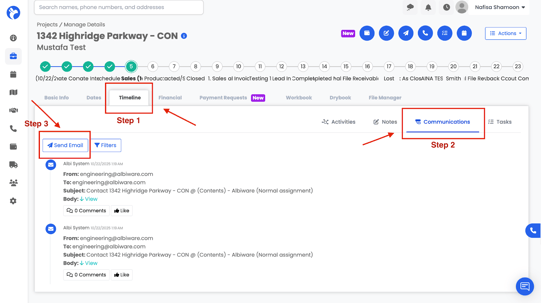 - Go to Projects → Timeline → Communications → Send Email to compose a message using an existing template.