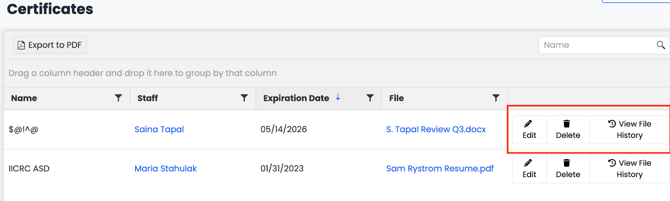 To view file history, click the History icon (if available) to see any previous versions or uploaded files associated with that certificate.
