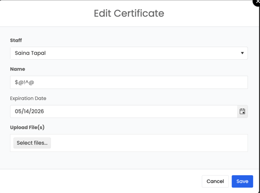 - This will open the certificate form, where you can update any details such as expiration date, name, or file attachments.