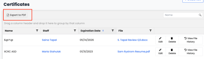 Use the Search Bar in the top-right corner to quickly find certificates by staff name or certificate name.