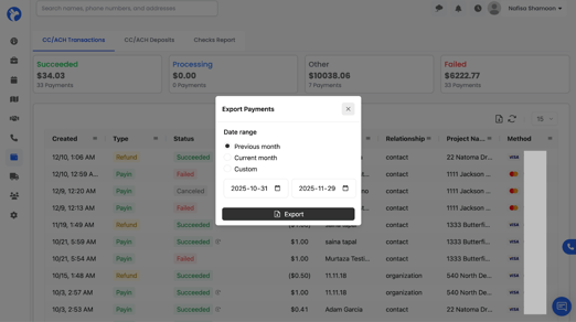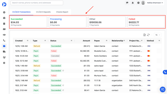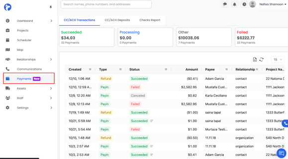 The Payments module in Albiware allows you to track all credit card (CC) and ACH transactions, monitor deposit activity, and review the overall financial performance of your payment processing. This section gives you a complete financial trail of every payment connected to your jobs.