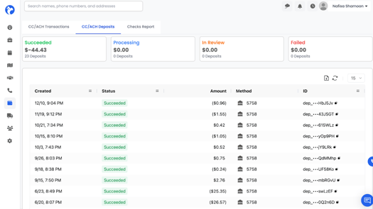 The Deposits tab shows the deposits sent to your bank from credit card and ACH transactions.