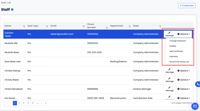 - Click on the staff name or on the right-hand side, click the Manage or Options button next to the staff member you want to update.