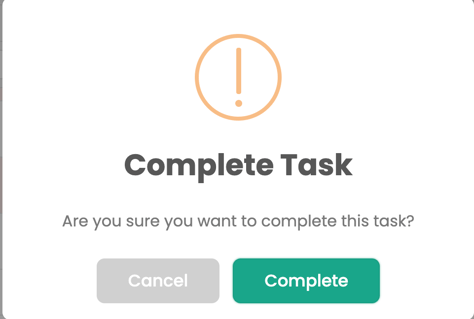 - Mark Complete – Marks the task as finished. When clicked, a confirmation message will appear (“Are you sure you want to complete this task?”). Confirm to mark it as complete.