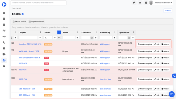 - Edit – Opens the task form, allowing you to update fields such as status, due date, or notes. After editing, click Save to update the task.