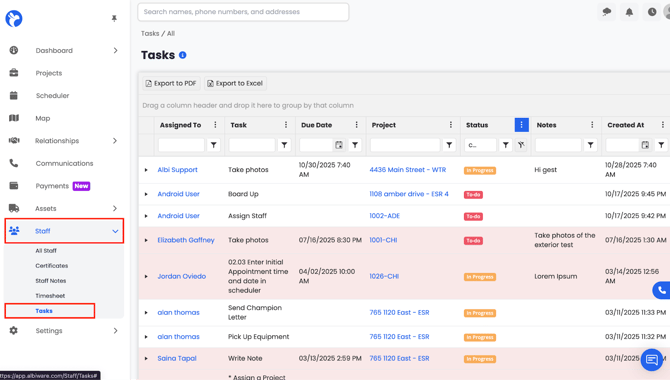 The Tasks Dashboard in Albiware allows you to create, assign, and manage tasks for your staff. You can link each task to a specific project, set a due date, update its status, and add notes for additional details. Tasks help keep your team organized and ensure all responsibilities are tracked and completed on time. From this dashboard, you can view all active and completed tasks, edit them as needed, and monitor progress — all in one centralized place.