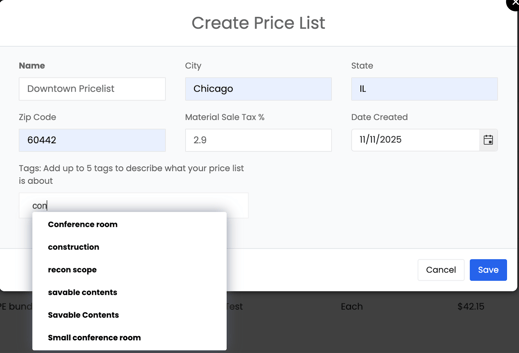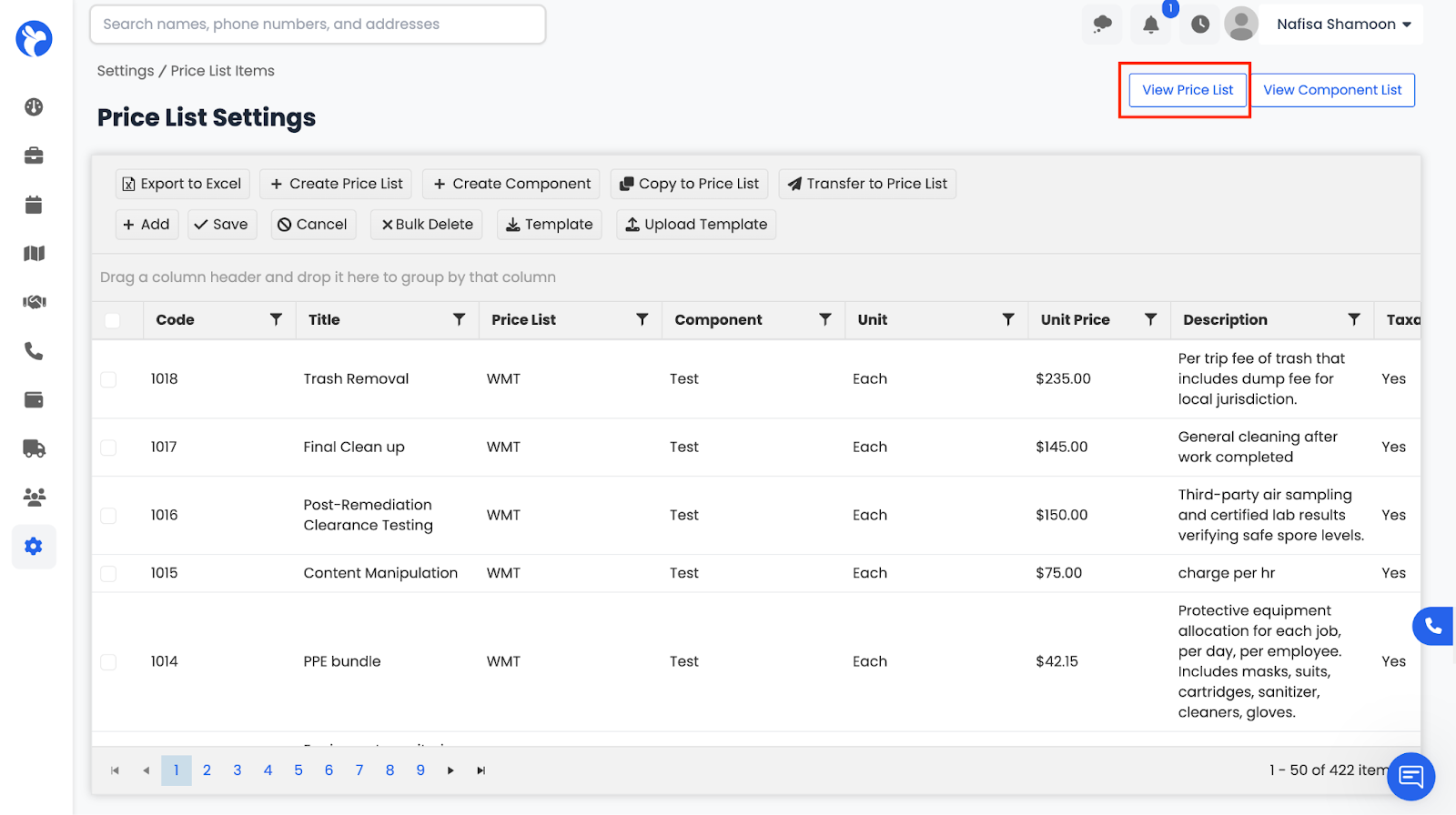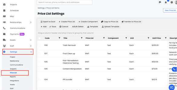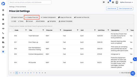 From here, you can view, create, and manage pricing items for labor, materials, services, or equipment. These price lists are automatically linked to your estimates, work orders, and purchase orders, ensuring consistent pricing across your entire company.