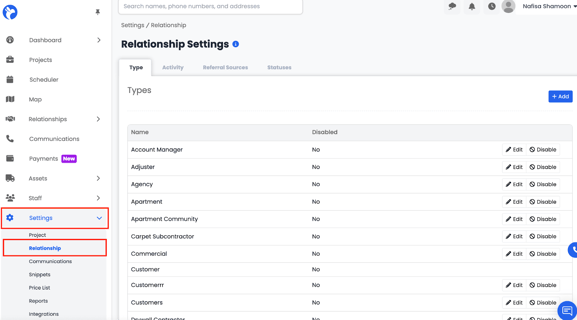 - The Relationship Settings page will open, displaying four tabs — Type, Activity, Referral Sources, and Statuses.