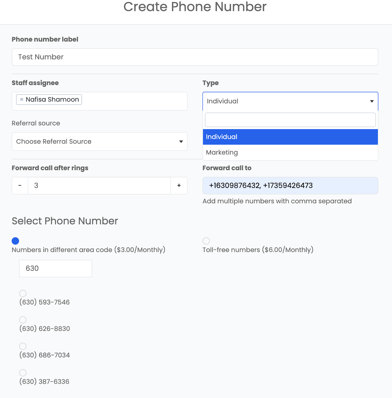 - Number Type – Select either a local number ($3.00/month) or a toll-free number ($6.00/month). Choose from the available generated numbers presented.