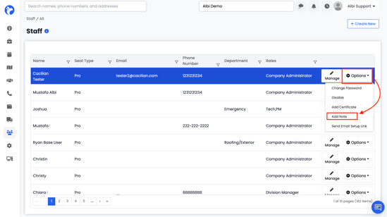 Navigate to the Staff Dashboard page using the sidebar, and find the staff member you would like to add a disciplinary action to in the All Staff page. Click on the Options button on the right hand side of your staff member’s row.