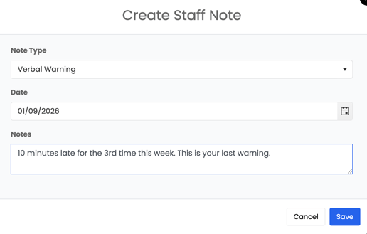 This place is a good place to keep track of employee "write-ups" and other important notes on those said employees. You can edit these types under Settings> Staff >Staff notes.