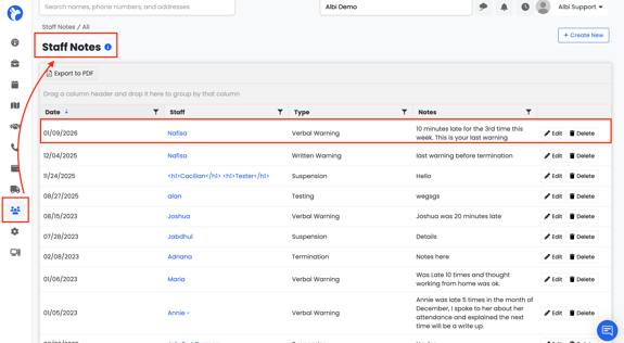 Navigate to the Staff module using the sidebar, go to Staff Notes and find the staff member for whom you would like to delete a disciplinary action for. Click on the Delete button to the right of that staff member’s row.