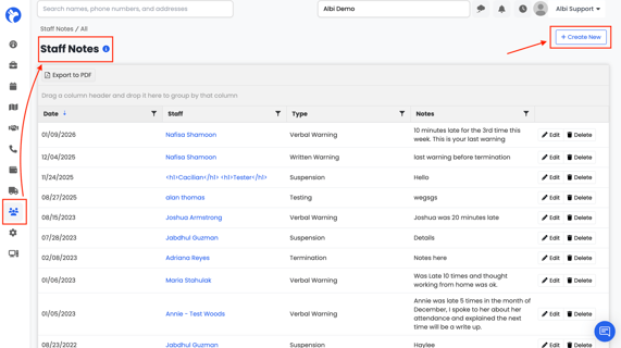 Navigate to the Staff Dashboard using the sidebar, go to Staff Notes and click on the Create New button on the upper right corner.