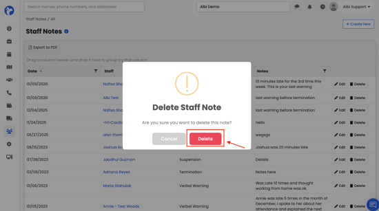 2. A Delete Staff Note pop up will appear, click the red Delete button to delete chosen disciplinary action.