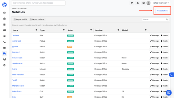 Go to the Assets tab from the main menu, then click Vehicles to open the Vehicles Dashboard. - Click “Create New.” in the top-right corner of the Vehicles Dashboard, click the Create New button. This will open a form where you can enter your vehicle details.