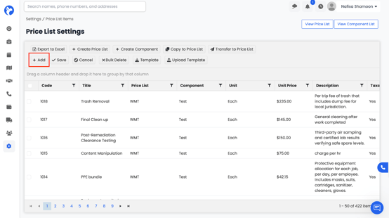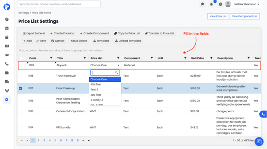 This article walks through how to manually add items to a Price List in Albi. It explains required fields such as code, component, unit, and price.