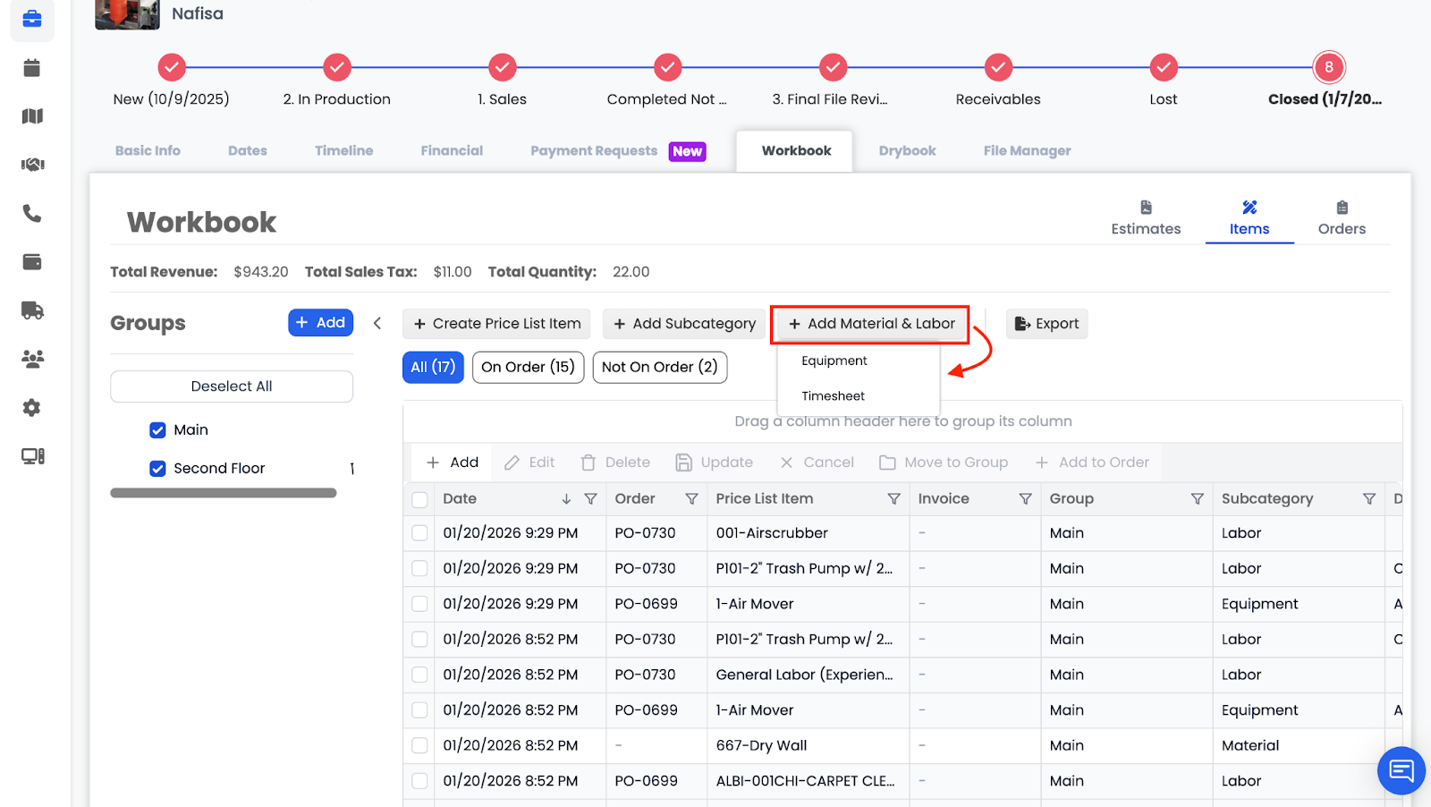 Click " Add Material & Labor"-> Select Equipment or Timesheet