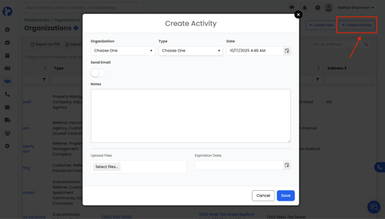 The Create Activity function lets you record important notes, reminders, or communications for any organization. Activities ensure everything connected to an organization is tracked in one place.