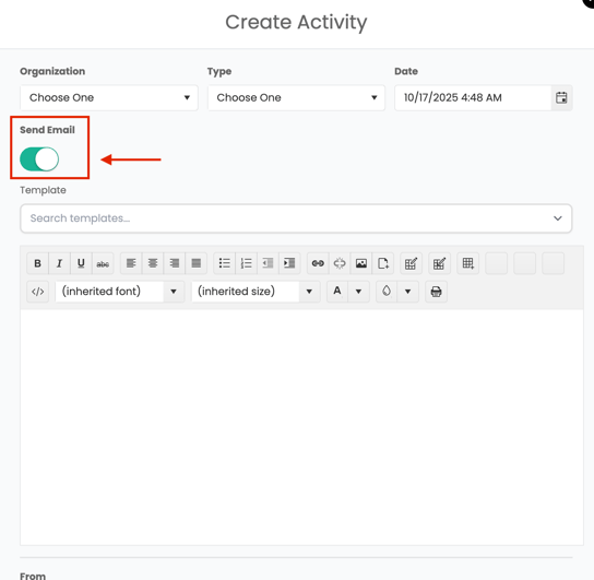 - Send Email (Optional): Toggle this on if you want your activity note to also be sent as an email.When this option is enabled, the note you write in the activity form can be sent directly to the selected contacts, and a record of that email will also be stored in the activity log.