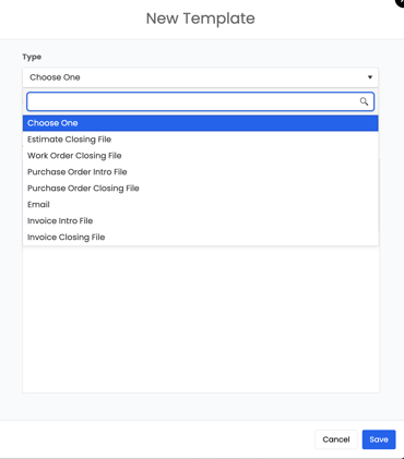 - Type of Template: Choose the type from the drop-down menu: Estimate, Invoice, Work Order, Purchase Order, etc.