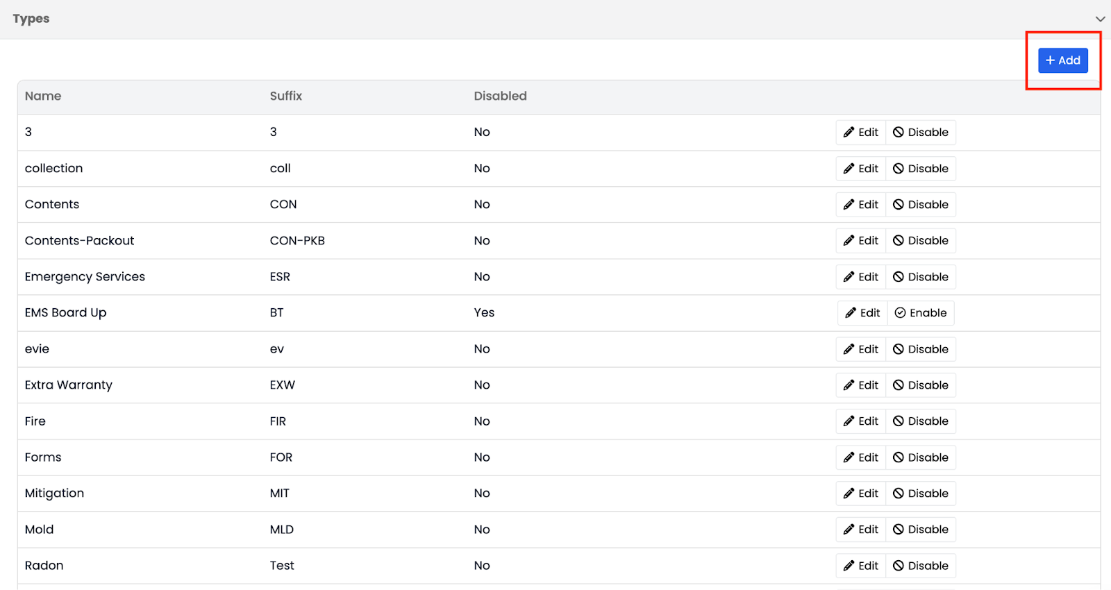 To add a new type, click the Add button on the right-hand side of the screen.