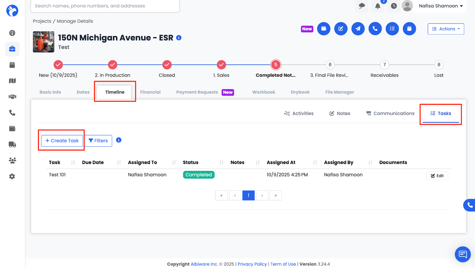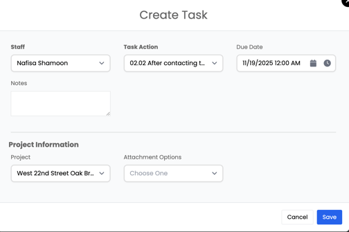 The Tasks section allows you to assign work items to staff members and view all existing tasks related to the project in one place.