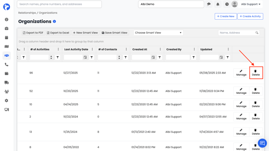 1. If you need to delete an organization, locate that organization under the Organizations module and click on the red Delete button to the far right.