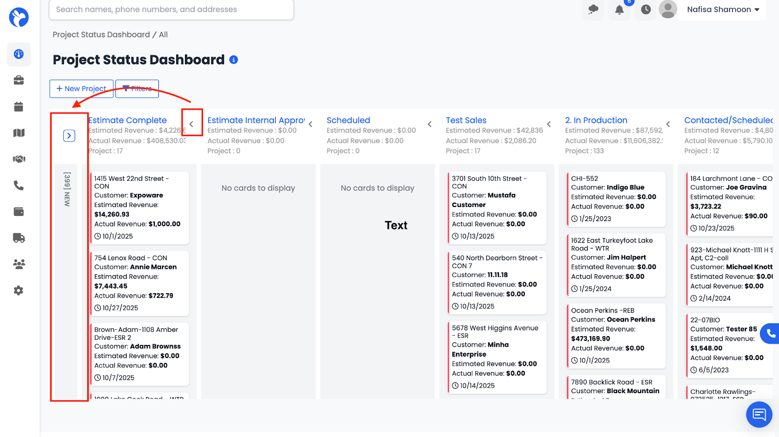 - Collapsed columns will display a summary count (e.g., “356 New Projects”, “22 In Production”).