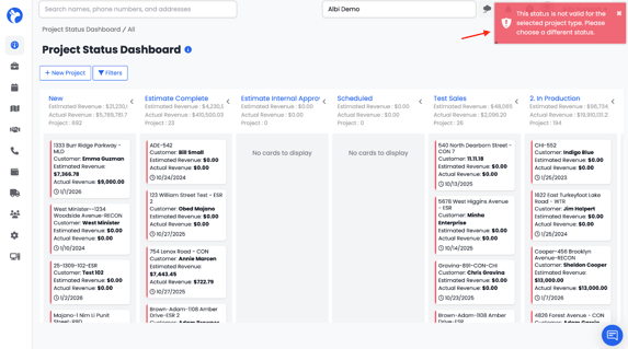 Each Project Type in Albi has its own set of allowed statuses. If a status is not enabled for that project type, the project cannot be moved into that column on the Status Dashboard.