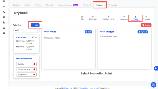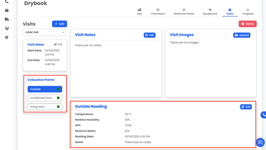 This article explains how to use the Visits section in DryBook to document each site visit. Visits capture readings, observations, photos, and changes to equipment, helping demonstrate drying progress and compliance.