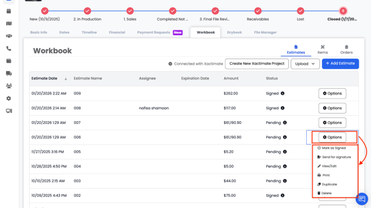 - Send for Signature : From the estimate list, click Options next to the estimate and select Send for Signature. This opens the estimate signature workflow.