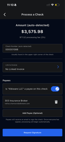 - Payees added: Tap Request Signatures