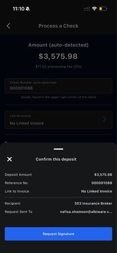 The per-transaction terms confirmation is a risk management requirement from Checkbook. It ensures the person initiating the deposit affirms the check details and payee information are accurate. This creates an audit trail and helps prevent misrepresentation. - What does "Requested" status mean?