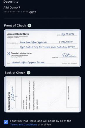Learn how to scan, submit, and deposit checks using Albi Pay Mobile Check Deposit.
