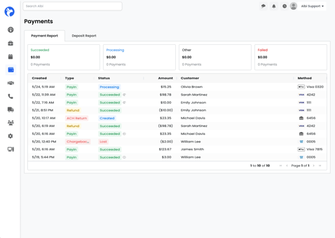 The Payment Report tab allows you to track the status of all payments processed through Albi Pay. Here, you can view essential details such as transaction statuses and manage refunds or chargebacks.