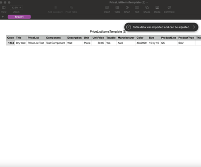 Albi allows you to upload price list items using a template spreadsheet.
