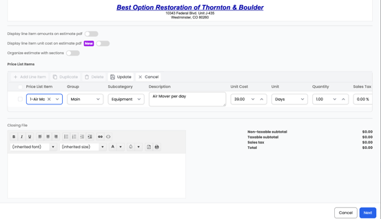 - The Estimate form will open, including sections for your Intro File, Closing File, and Line Items.