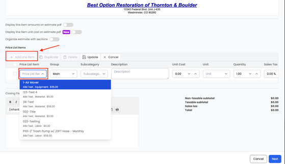 This article explains how Price Lists are used inside projects. It covers selecting items when building estimates, adjusting quantities and pricing, and adding items to the Workbook.