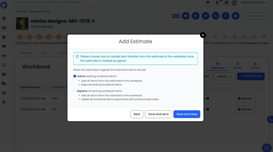 8. Choose your preference, then click Save & Close to save the estimate or click Save & Send to save and send the estimate for signature.