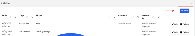 - Each activity shows the date, type, notes, contact, and who created it.
