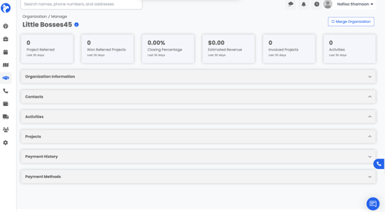 In the Projects tab, you’ll find all projects linked to that organization. This makes it easy to see what work has been or is being done for them.