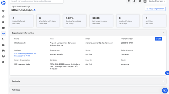 Activities – A timeline of notes and emails tied to the organization, with the option to create new activities.