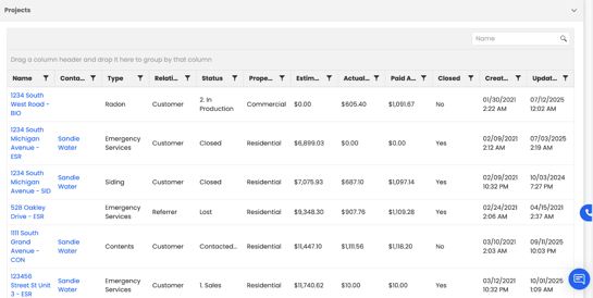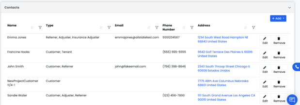 - Relationship - shows how the company or contact is connected to the project (for example, homeowner, property manager, adjuster, subcontractor, etc.).