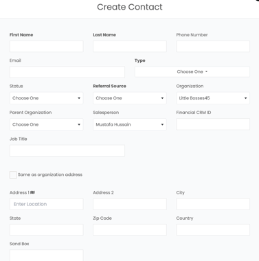Contacts – Add new contacts or link existing ones, including names, phone numbers, addresses, emails, and roles.